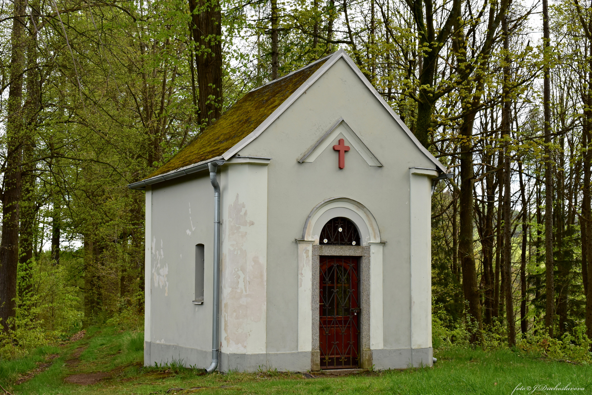 Vnitřek kaple Křížové cesty. (Foceno přes sklo dveří).